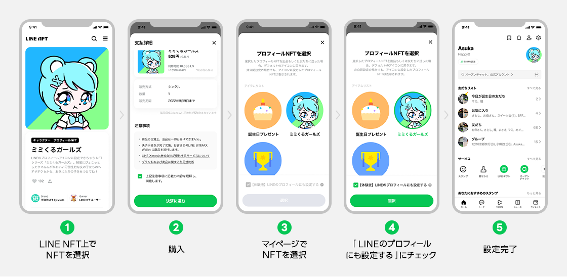 LINE NFTより提供する体験版「プロフィールNFT」機能では、保有しているNFTを、国内約9,200万人が利用するコミュニケーションアプリ「LINE」のプロフィールアイコン及びLINE NFT上のマイページへの設定が可能です。