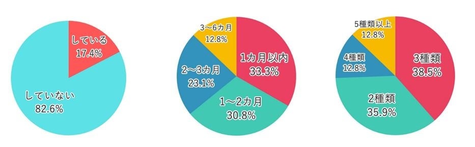 種類 3種類 38.5%、2種類 35.9%、5種類以上 12.8%、4種類 12.8%
