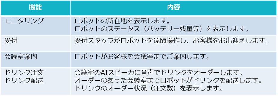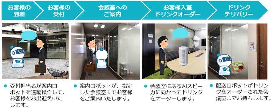 受付・案内・ドリンク配送業務において従来人が対応していた業務の一部をロボットが担います。