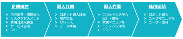 ※初期導入費用には、導入手順(例)のうち、現地調査・ロボット導入(マップ作成、会議室登録、現地テスト)・ユーザ教育が含まれています。