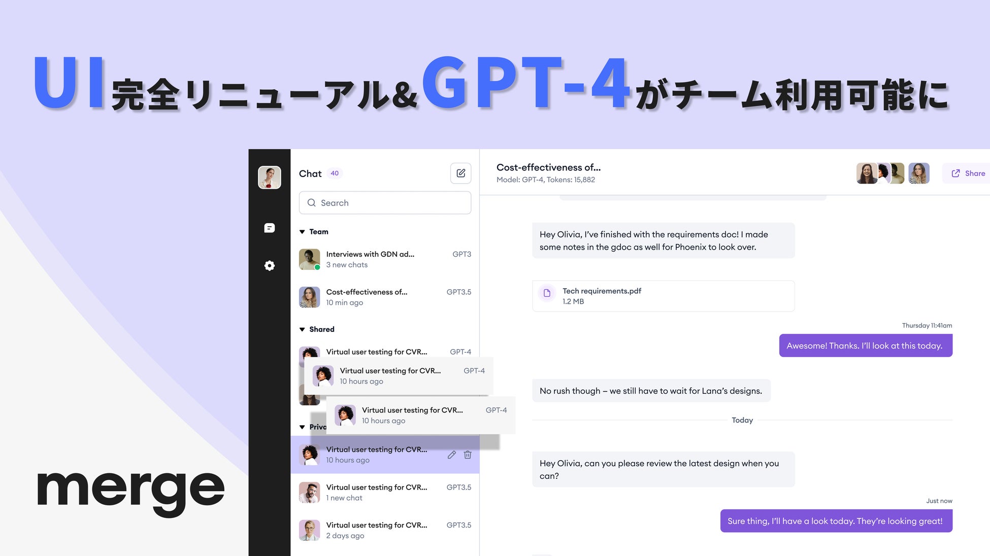 【Merge】UI完全リニューアル & GPT-4を搭載開始。サービス利用料は0円。API料金のみでGPT4をご利用いただけます。
