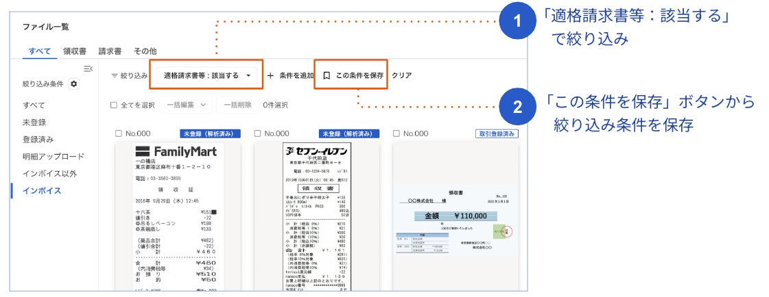 また、ファイルを絞り込むための条件(例:インボイスか否か)を保存できるようにすることで、よりユーザーが運用しやすい形でのファイルの管理ができます。