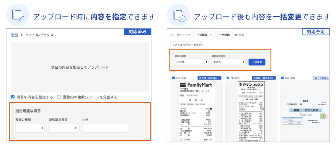 freeeが提供している領収書や請求書の画像、CSVやPDFなどのデータを取り込むことができるファイル管理機能であるファイルボックス機能において、インボイス項目の追加とAI-OCRによる画像解析に加えて下記の項目に対応予定です。