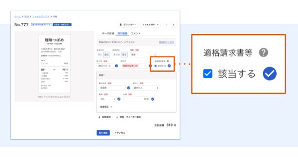 ファイルアップロード時に書類の種類・適格請求書等の指定が可能です。アップロード後にも同様に指定できます。
