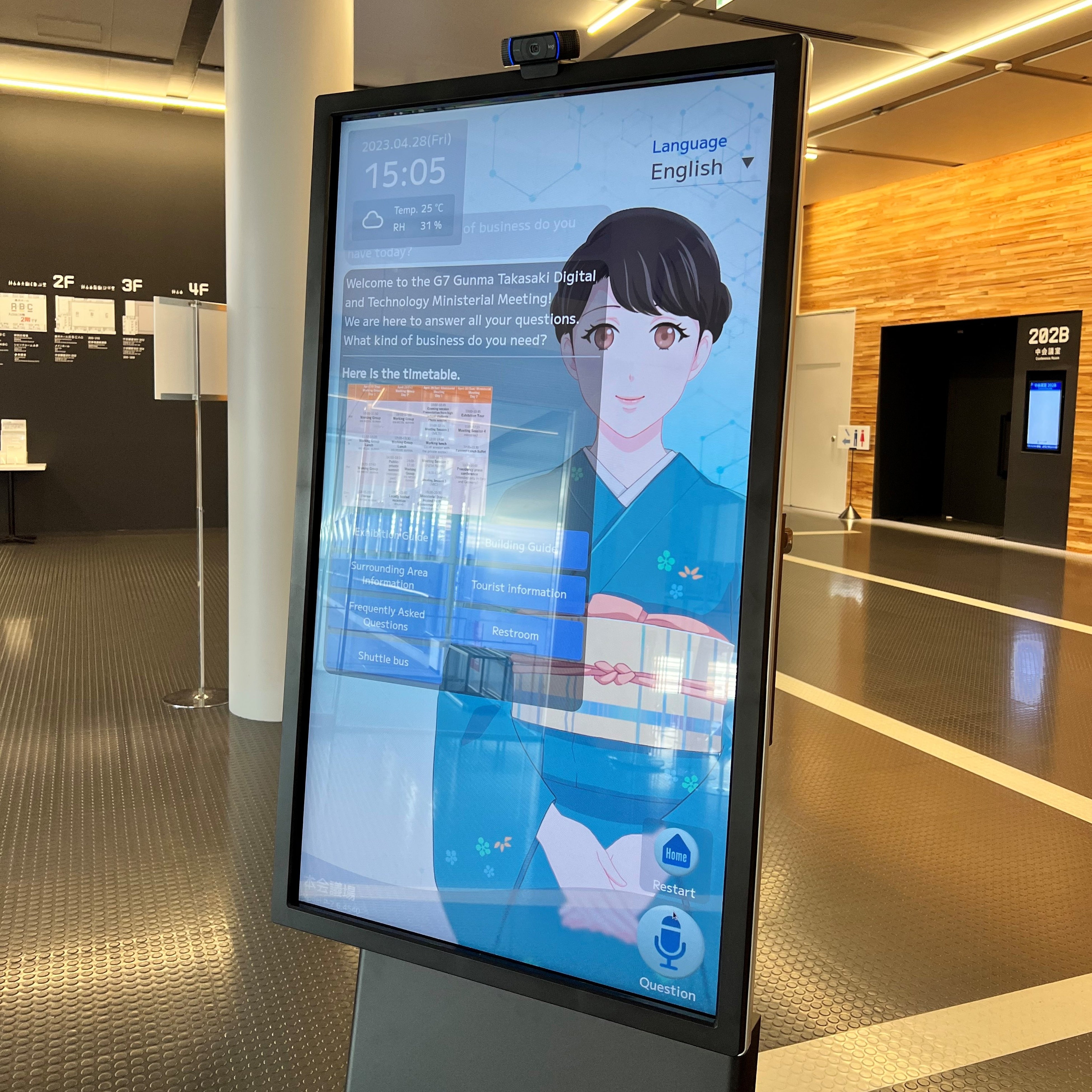 本会合では、会場エントランスロビーに設置したディスプレイ上でAI対話機能を通じて、音声認識を使った問い合わせ内容の自動応対や、チャットボットでのよくある問い合わせの回答を行いました。また、各会議のプログラムや会場施設内の情報に加え、周辺の観光情報などを無人で案内しました。今回のような国際会議で必須となる多言語でのご案内にも対応し、利便性の高い接客サービスを実現しています。
