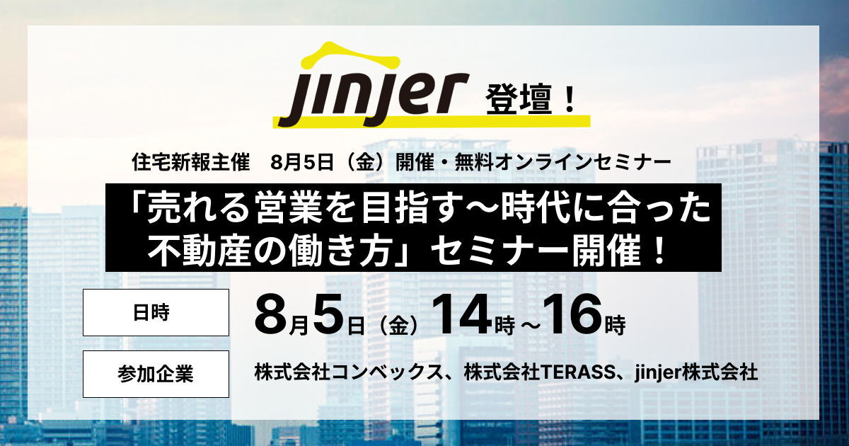 不動産を購入・売却されるお客様に対して「もっと良い提案ができたのではないか」と疑問を抱いたご経験はないでしょうか。そのような疑問に対して本セミナーでは、営業マンの売上向上・スキルアップをかなえながら、時代に合わせたスマートな働き方を実現するツールを提供している、株式会社コンベックスと株式会社TERASSが合同で「売れる営業を目指す」と題したテーマで説明していきます。jinjerからは「電子契約と不動産」といった観点で、プロダクトデザイン本部の松葉が、不動産取引における電子契約の基本情報を解説しながら、電子契約が不動産業界の働き方にどのような影響を与えているかを不動産会社の実例を踏まえて説明します。