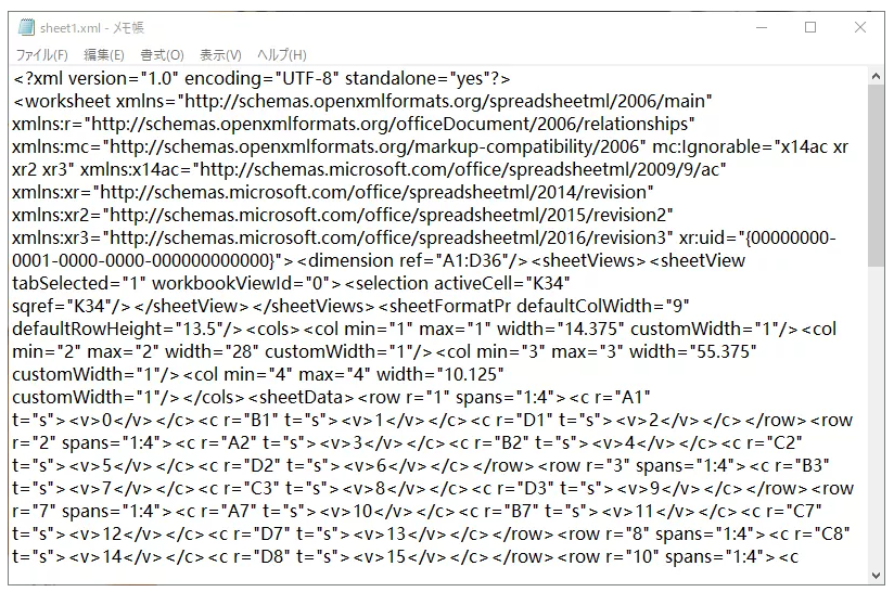 Step5:「Sheet1.xml」をメモ帳で開きます。