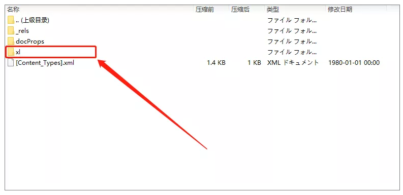 Step2:zipファイルを開いて「xl」ファイルをクリックします。
