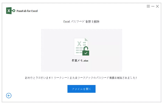 Step5:「ファイルを開く」をクリックすると、保護が解除されたExcelファイルを確認できます。