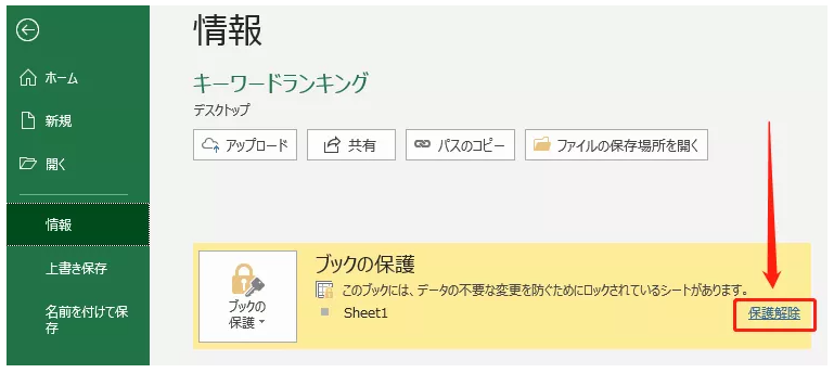 最後に、「ファイル」の情報から保護を解除する方法を見ていきましょう。