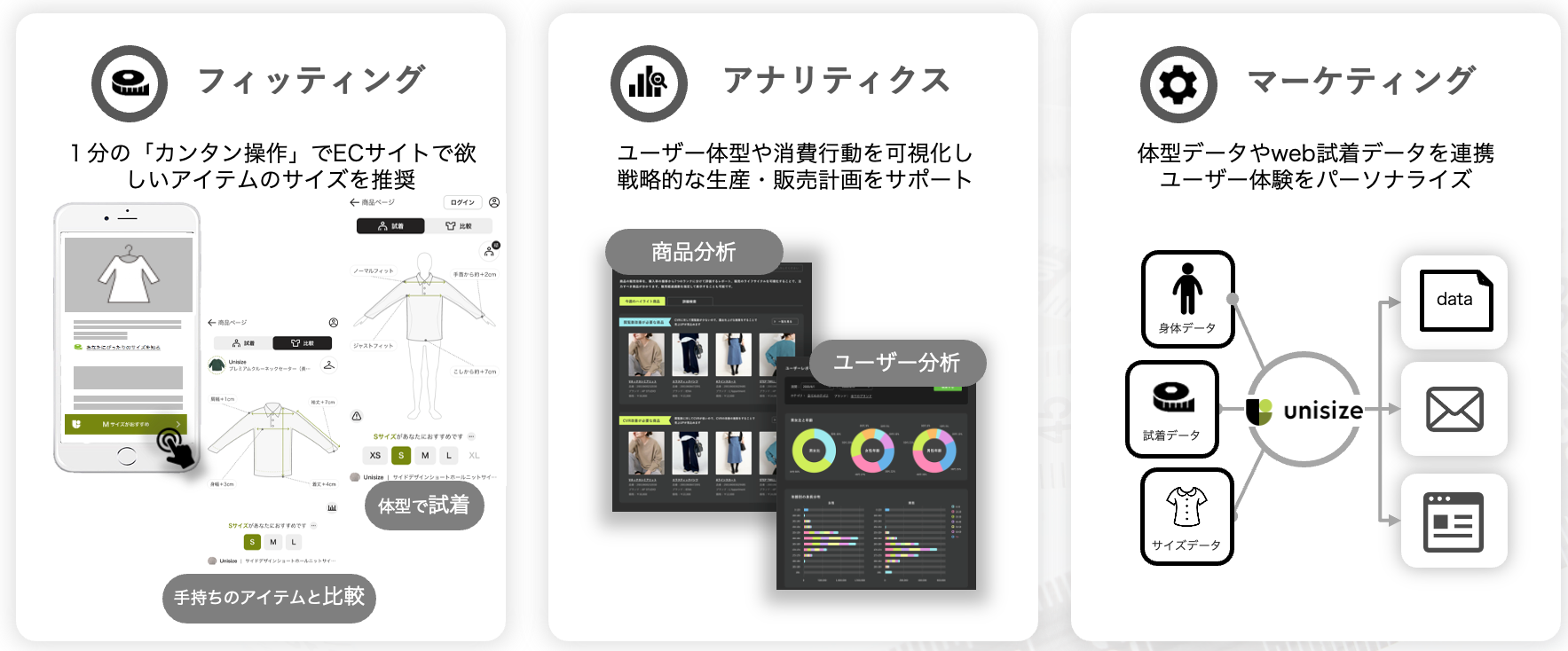 他にも、ユーザー体型データやECサイトでの試着行動・購入データを活用できる「unisizeDX」など、アパレルECの「サイズ」の課題に多方面からアプローチする機能が取り揃えられています。