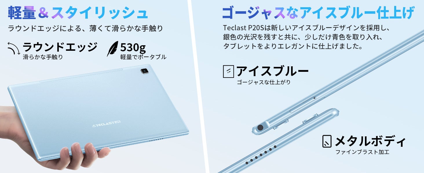 Teclast「P20S」は新しいアイスブルー金属ボディデザインを採用し、銀色の光沢を残すと共に、少しだけ青色を取り入れ、タブレットをよりエレガントに仕上げました。ラウンドエッジによる、薄くて滑らかな手触りが感じます。厚さは9mm、重量は900gです。通常なタブレットと比べると少し重いですが、持ち運びにも便利です。