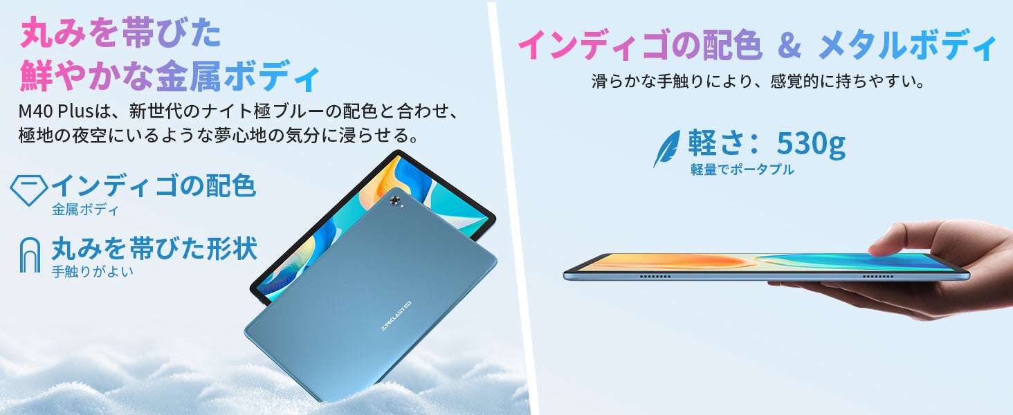 Teclast「M40 Plus」は、信号オーバーフローを金属ボディに組み込んだ新しいデザインが採用されています。滑らかな手触りにより、感覚的に持ちやすいです。新世代のナイト極ブルーの配色と合わせ、極地の夜空にいるような夢心地の気分に浸らせます。約530gの重量で、持ち運びにも便利です。