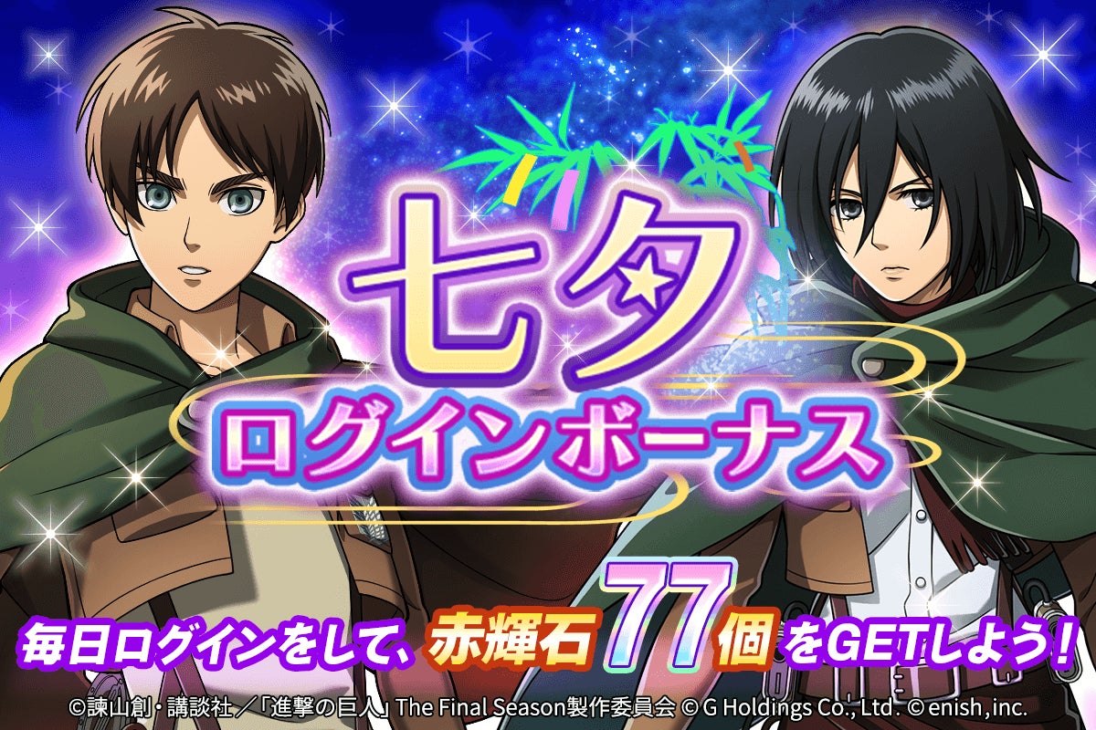 株式会社enish(本社:東京都港区、代表取締役社長:安徳 孝平、以下enish)は、アニメ『進撃の巨人』のスマートフォンゲーム最新作「進撃の巨人Brave Order」にて、「巨人研究強化合宿キャンペーン」を開催!期間中、依頼書クエストの巨人研究資料のドロップが1.5倍に!この機会に巨人研究を進めて戦闘力を強化しよう!また、本日より、【礼服】リヴァイを含む碧属性団員がピックアップされたガチャも開催!更に、7日間毎日、赤輝石77個がもらえちゃう七夕ログインボーナスの開催や新たな連合クエスト追加など盛りだくさん!その他、最新情報はゲーム公式サイト・ゲーム公式Twitterアカウントにて随時公開して行きますので、ぜひご覧ください。