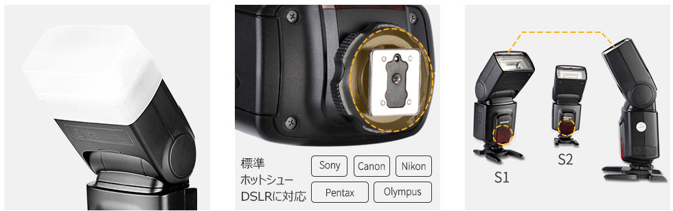 【ディフューザー付き】:激しいフラッシュライトを柔らかくし、オブジェクトの影を薄くし、フラッシュライトをよりバランスのとれたものにします。