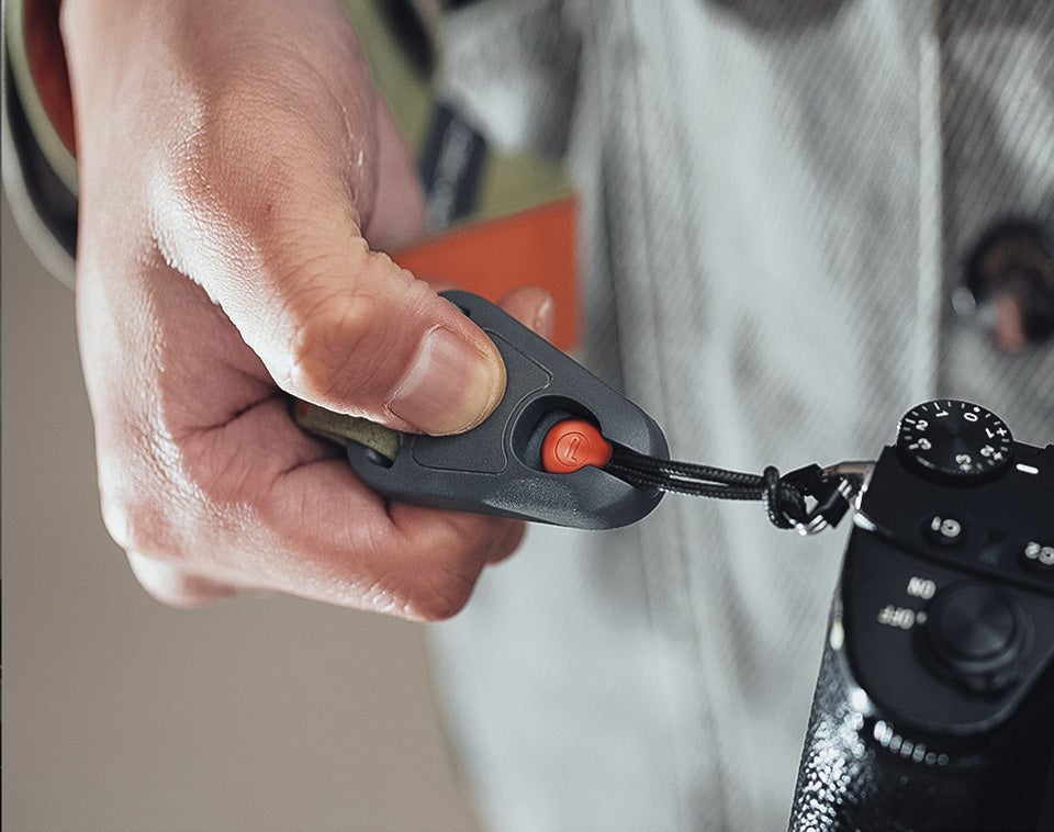 カメラストラップの着脱には、デッドセンターロック機構を採用しています。クイックコネクター上部を押すと、片手でも簡単にクイックリンクの着脱が可能で、丸く成型されたクイックリンクがロックされている状態では、全方向から力が加わってもクイックリンクが外れる事は無く、ストラップからの脱落を引き起こしません。素早い着脱と、信頼のロック機構で安心してご利用いただけます。