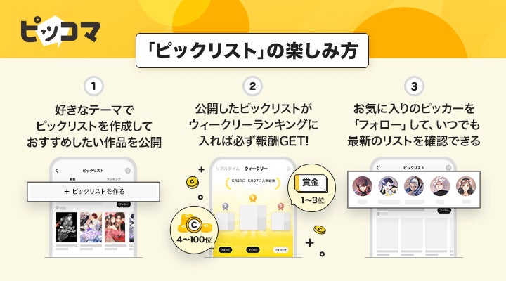 ピックリスト専用ページでは、人気の高いピックリストがランキング化され、毎週日曜日に、上位100位までの順位が公開されます。1位のピックリストを作成したピッカーには賞金5万円を贈呈、2位・3万円、3位・1万円と続き、4位〜100位のピッカーには、順位に応じて、ピッコマアプリ内で使用できるコインが贈呈されます。