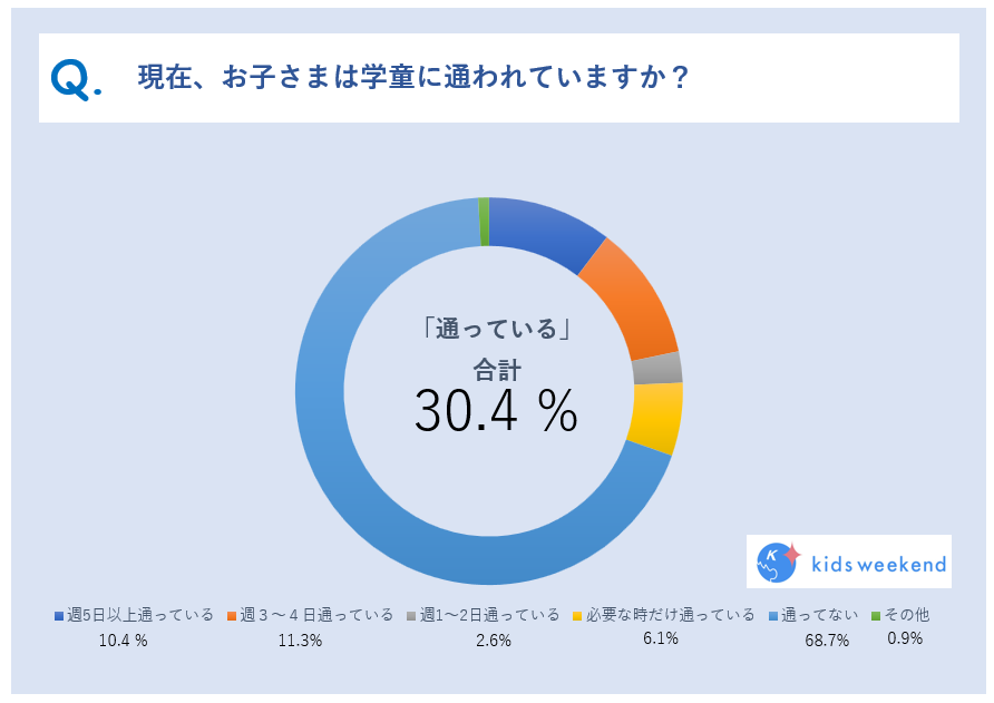 調査当時、お子さまが「学童に通っているか?」に対しては11.3%が「週3~4日通っている」と回答し、10.4%が「週5日以上通っている」、「週1日以上通っている(2.6%)」、「必要な時だけ通っている(6.1%)」と、頻度を別にすると合計30.4%のお子さまが学童を利用なさっていました。また、通っている習い事では第1子、第2子共に「英語」、「水泳」、「体操」、「ピアノ」、「学習塾等」などが上位を占めつつ、何かしらの習い事をご活用でした。お子さまの放課後の過ごし方として、オフラインの学童や複数の習い事は一般的となっており、保護者にとっては送迎の必要や、塾・習い事を継続していくうえで発生する教育費用の負担は少なくないことが推察されます。
