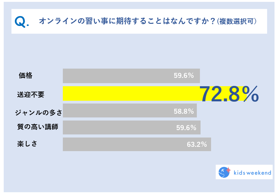 そこで「オンラインの習い事に期待することはなんですか?」という問いへの回答では、そうした保護者の負担がリアルに垣間見え、「送迎不要」が72.8%と最多、次いで「楽しさ」が63.2%、「質の高い講師」や「価格」も共に59.6%と高い数値を示していました。教育そのものの質はもちろんのこと、働き盛りの保護者たちの多忙な日常では、送迎が不要であることは大きなベネフィットであり、オフラインと異なる新たな教育アプローチに対しては、コストを抑えたいという切実な意向も顕著に見られました。