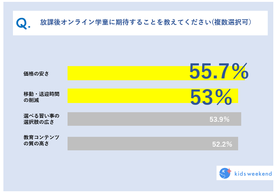 アンケート回答者である保護者の方々は、「放課後オンライン学童に期待すること」として、費用や送迎時間の短縮といった回答はもちろんのこと、「選べる習い事の選択肢の広さ(53.9%)」、「教育コンテンツの質の高さ(52.2%)」といった、学びの質や体験選択肢の豊富さなどを求めていることがわかります。キッズウィークエンドスクールでは、宿題をチューターに見てもらいながら進める《学習タイム》をはじめ、イラストやサイエンスなど興味を深める《探究》や、その道のプロのリードで社会とつながり探究する《クラブ活動》、教科や実験などを個別指導で学習する《習い事》ができる環境が整備されています。