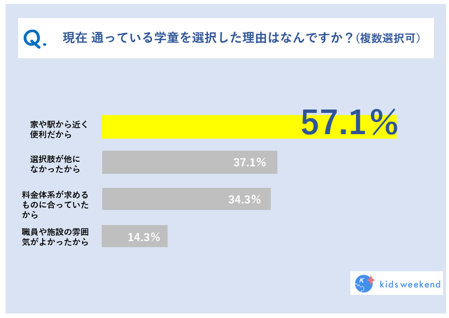 また、学童を利用している保護者の選択理由のトップが「家や駅から近い(57.1%)」と立地の利便性を挙げており、多忙ななかでも効率を重視している一方で「選択肢が他になかったから」という消極的な回答も37.1%と少なくない数値となっています。