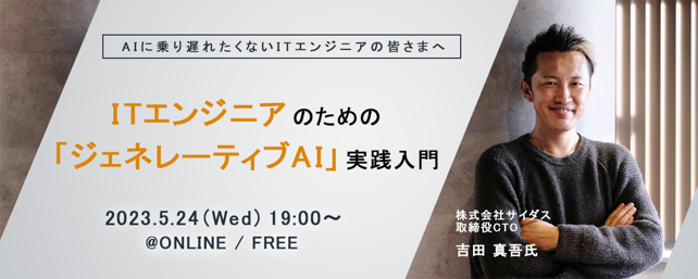 本セミナーでは、株式会社サイダス 取締役CTO 吉田真吾氏を講師に迎え、「ジェネレーティブAI」の現状や基礎知識から、実践的な活用方法までを解説。専門家でなくても「ジェネレーティブAI」を活用できるよう、ChatGPTを活用したサービスをリリースするまでの実体験についてお話しします。