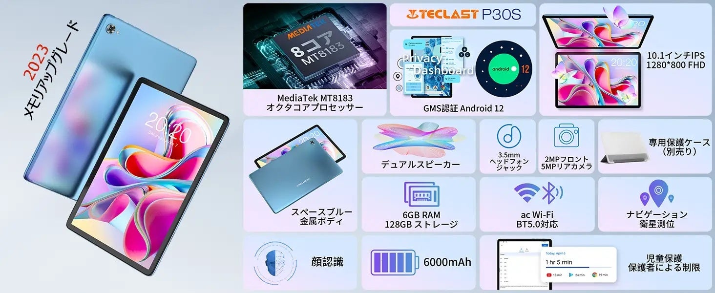 P30Sは、新世代のPureSound Audio スピーカーを採用し、独立したアンプチップに合わせて使用すると、臨場感あふれるオーディオ体験ができます。3.5mmヘッドフォンジャックを備え、様々なユーザーの好みに対応できます。また、保護者が懸念するタブレットの使用時間や使用アプリの選択などの問題点に対応し、新たな児童守護機能を開発しました。学びと遊びをバランスよく楽しめるタブレットになります。