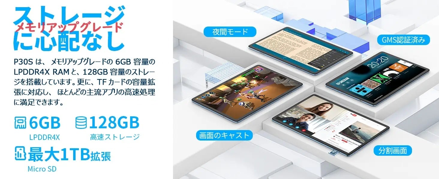 8GB LPDD4Xメモリと128GB UFS2.1ストレージでマルチタスク処理、インストールと起動をより高速化になります。また、TF拡張もサポートしているため、容量の不足を心配する必要がありません。OfficeやZoomなどのアプリケーションで生産性を高め、Bluetoothキーボードやマウスなどさまざまな周辺機器と接続することで、PCのような使い勝手を体感できます。
