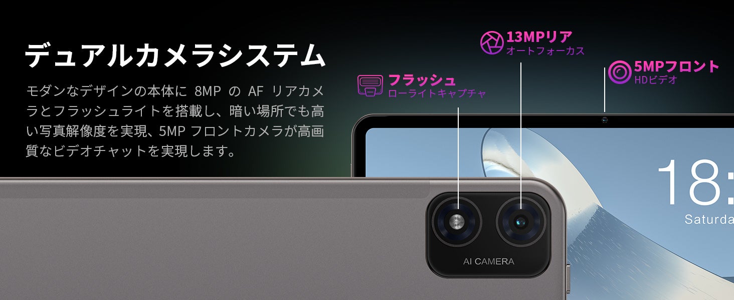 モダンなデザインの本体に8MPのAFリアカメラとフラッシュライトを搭載し、暗い場所でも高い写真解像度を実現、5MPフロントカメラが高画質なビデオチャットを実現します。フロントカメラは、顔認証によるロック解除に対応しています。設定で顔情報を登録するだけで、素早く顔認証スキャンしパスワード情報を漏洩することなくタブレットシステムに簡単にアクセスできます。