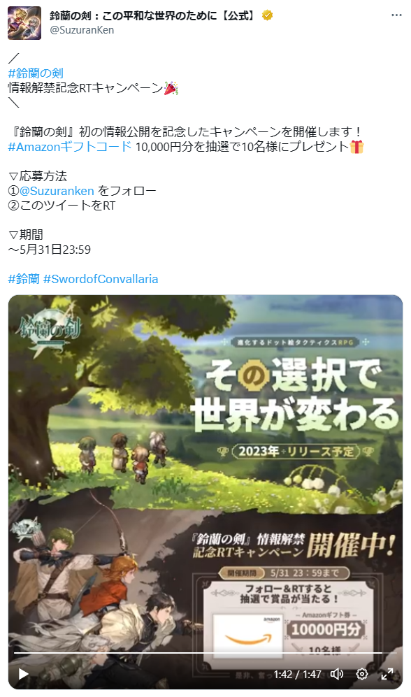 ■ 「鈴蘭の剣」情報解禁記念RTキャンペーンは只今時間限定開催中!フォロー&RTすると抽選でAmazonギフト券10,000円分が当たるチャンス!
