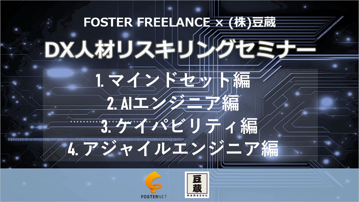 掲題の通り、フォスターネットと豆蔵が連携しITフリーランスの方を対象に全4回の「DX」人材への「リスキリング」をテーマとしたセミナーを開催致します。