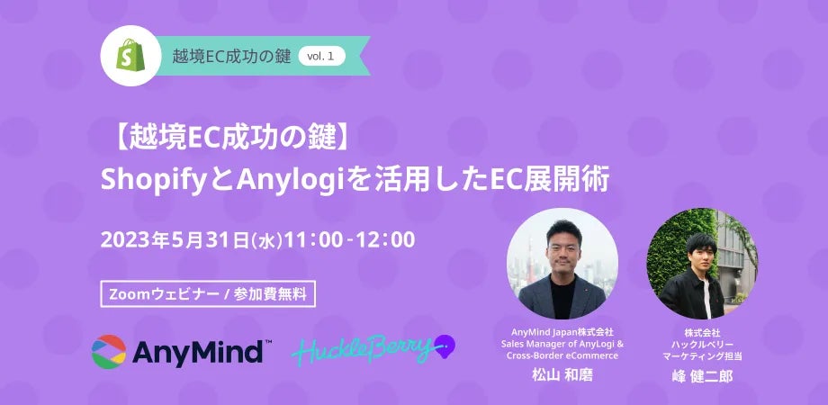 AnyMind Group株式会社(読み:エニーマインドグループ、代表取締役CEO:十河 宏輔)は、Shopifyを用いたECサイト構築をサポートする株式会社ハックルベリーと共催で、2023年5月31日(水)11:00より越境ECでの成功を目指すEC事業者向け無料オンラインセミナー「【越境EC成功の鍵】ShopifyとAnylogiを活用したEC展開術」を開催いたします。