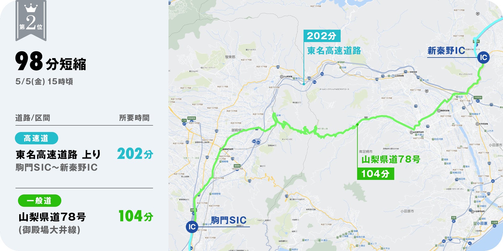 本ランキングでは、ゴールデンウィーク後半の2023年5月3日(水)から2023年5月7日(日)までの、ナビタイムジャパンの提供するカーナビアプリのプローブ情報※を分析し、高速道路をそのまま走行した場合と比べて、高速道路を一旦降りて一般道を走行し、再度高速道路に乗った場合により多くの時間を短縮できた「抜け道」をランキング化しました。