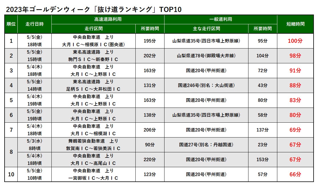 株式会社ナビタイムジャパン(代表取締役社長:大西啓介、本社:東京都港区)のドライブ事業は、2023年ゴールデンウィークのカーナビアプリの走行実績を分析し、高速道路と比べて所要時間の短かった、一般道を使った「抜け道ランキング」を発表いたします。