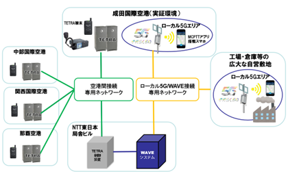 今回、このWAVEを成田国際空港に実証実験環境として「ギガらく5G ®」で構築されたローカル5Gシステムと相互接続することで、ローカル5G対応のスマートフォンとTETRA端末との間や、当該スマートフォン同士の閉域網での音声通話を可能としました。これにより、従来の携帯電話網での接続と比較し、より高品質で安定した環境での空港業務遂行が可能となります。