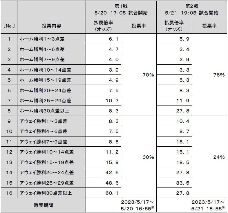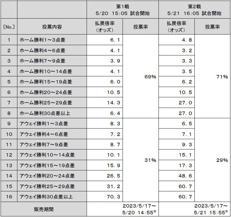 ※1 5月19日(金)17時時点の投票状況となります。払戻倍率(オッズ)は、投票状況により販売終了まで変動します。払戻倍率(オッズ)は、スポーツくじオフィシャルサイト(https://www.toto-dream.com/)で随時更新しています。