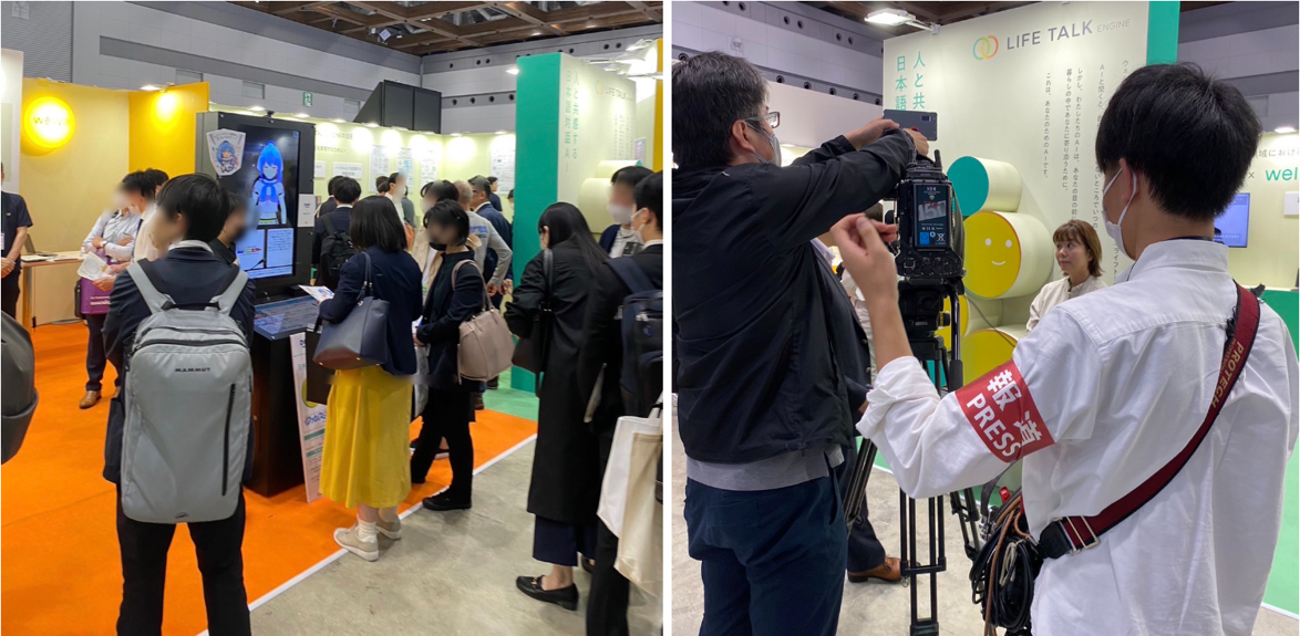 当社ブースでは、「健康に生きる」をテーマにLIFE TALK ENGINEが社会に実装されることで、高齢者の暮らしがどのように豊かで便利になるのか、健康をサポートするさまざまな取り組みをご紹介しました。AI・人工知能EXPO【春】には延べ3万名が来場、ウェルヴィルブースは多数のメディアに取り上げていただくなど、終日大盛況でした。