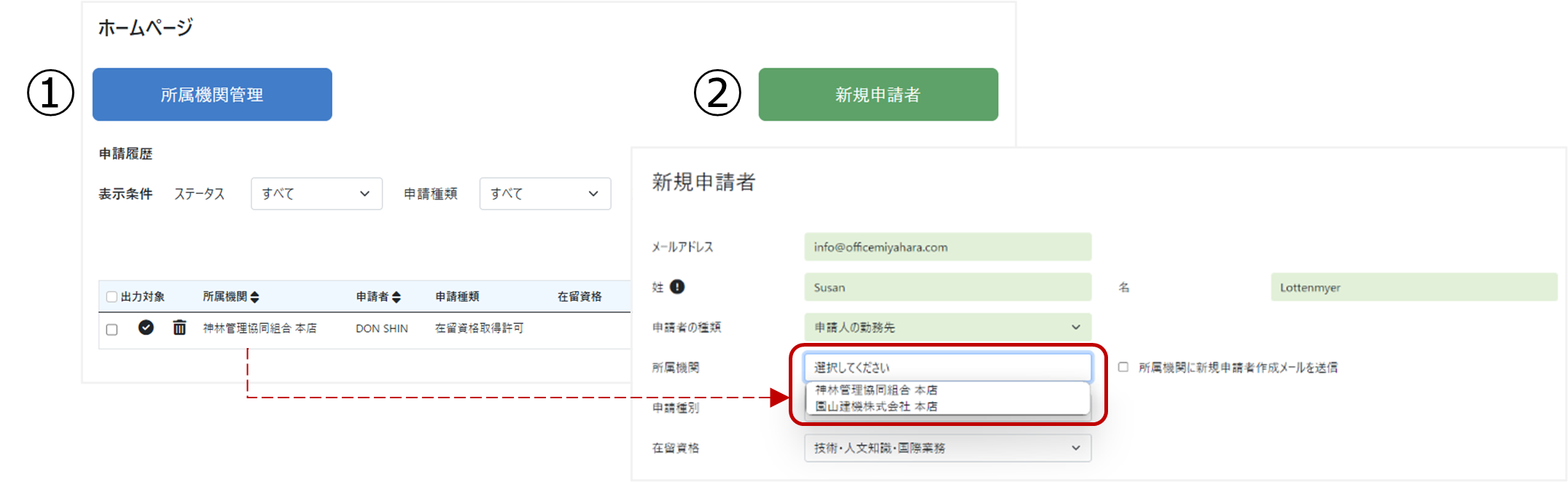 所属機関管理ボタンから顧客先の情報を登録します。新規申請者ボタンから申請者情報を登録します。申請者の所属する勤務先に先に登録した所属機関から選択をします。