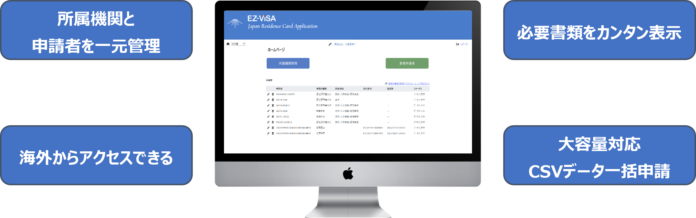 イージービザの特徴は、クラウド型データ管理オンラインシステムで、グローバルな環境に対応したシステムで、インターネット環境さえあれば、海外に住む外国人もアクセスができるオンラインシステムです。