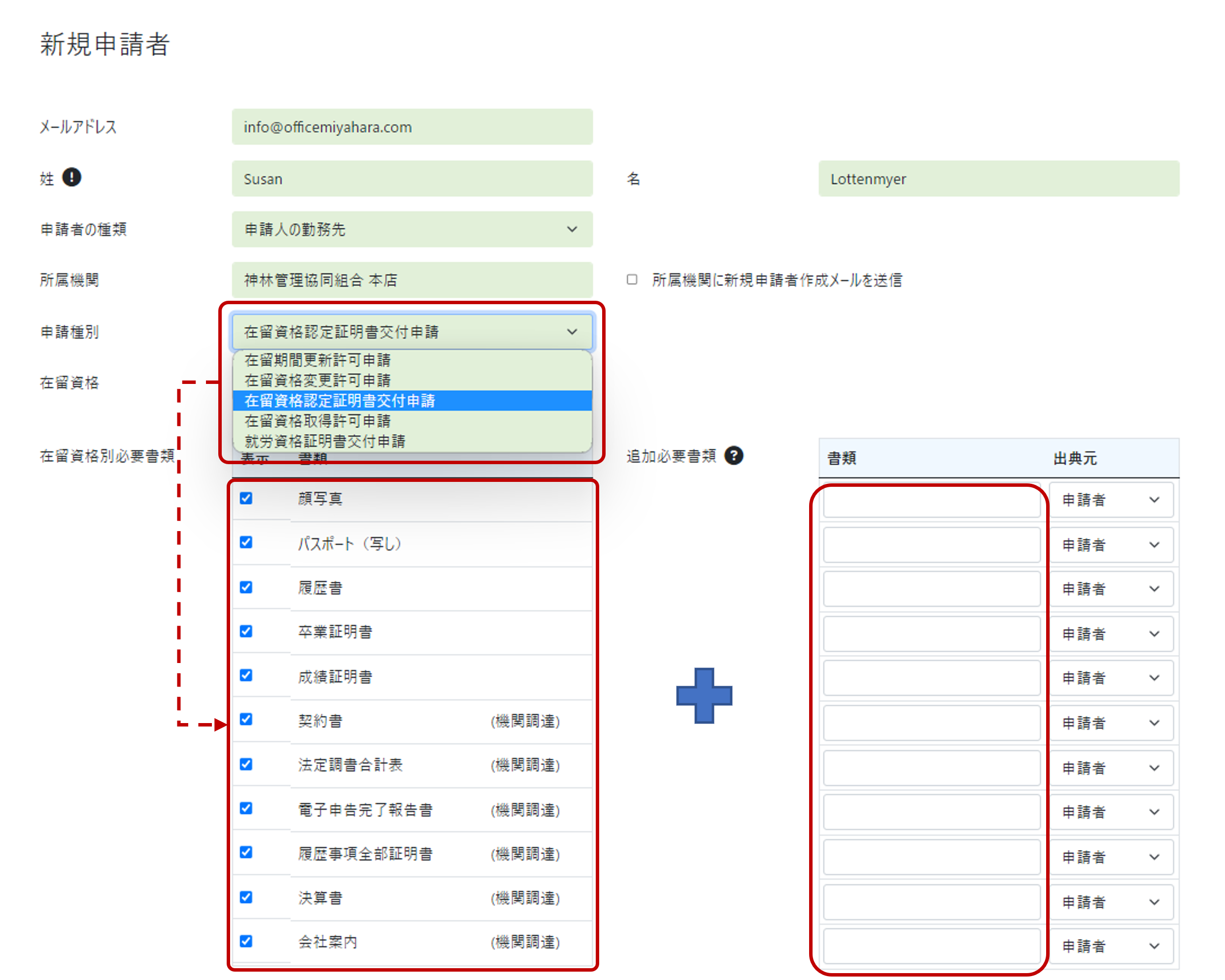 同じ在留種別を申請する場合でも、人によって提出書類は異なる場合もあり、チェックを外して変更ができ、追加書類が必要な場合は、自由に右側の欄に追加入力ができます。