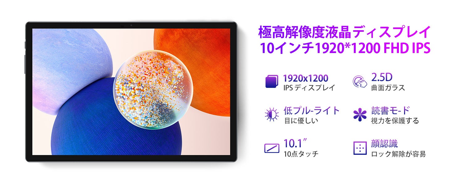 視野角が広く、卓越した演色性を備えたディスプレイがあり、画面上のあらゆるものを表示するのがはるかに楽しくなります。BOEテクノロジー広視野角の10.1インチIPS FHDスクリーンは、印象的な視覚体験を提供します。軽くて薄い金属製の筐体が利用して、2.5Dタッチスクリーンと湾曲したエッジと組み合わせ、スムーズなタッチ体験を提供します。