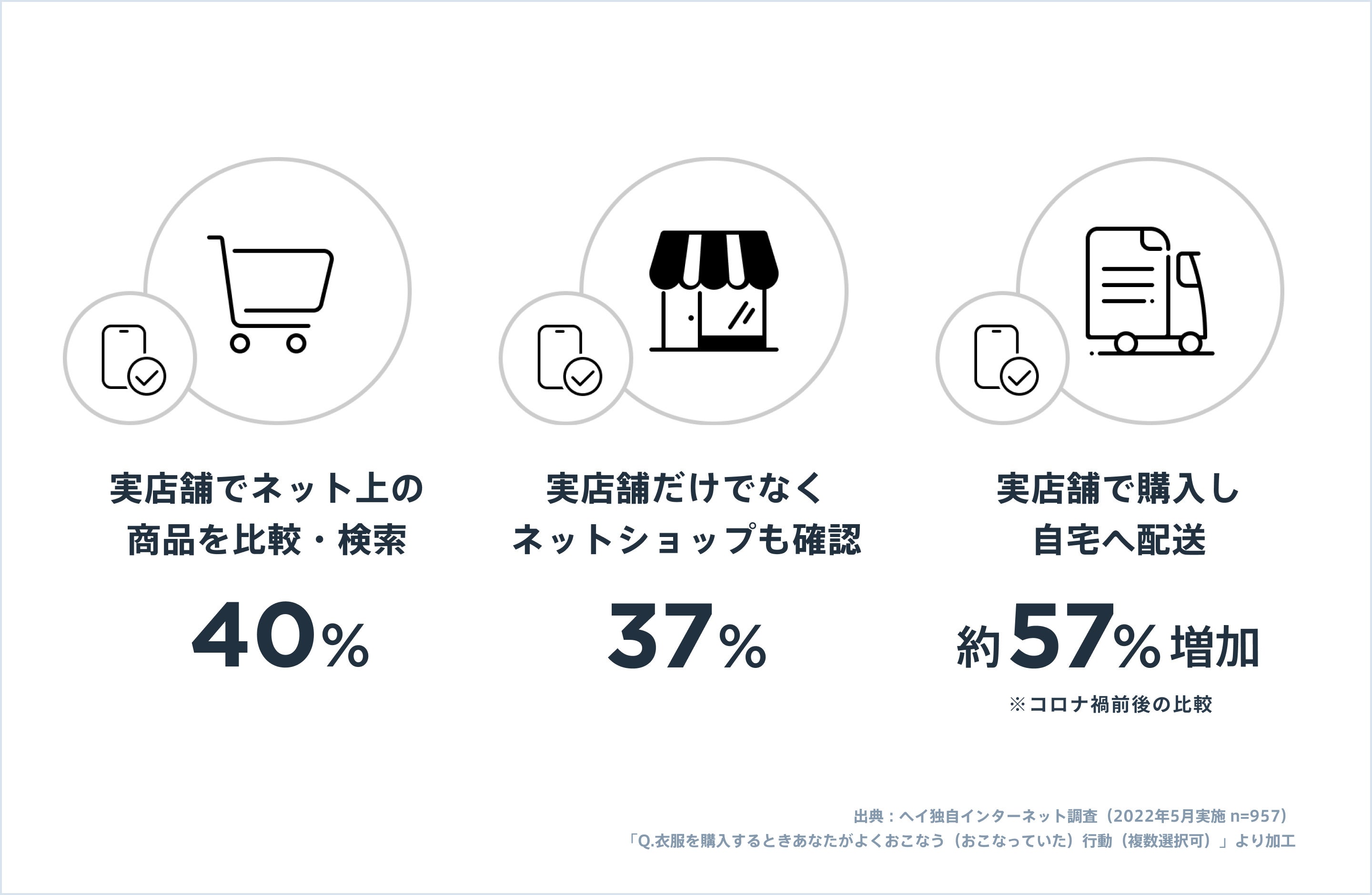 また、消費者の行動も変化し「店舗でほしいと思う商品を見つけたら、その場で買わずネットショップに商品があるか探す」「気になる店舗を見つけたら、ネットショップがあるかチェックする」など、オンラインとオフラインを行き来する購買行動は大きく広がりを見せています。(※データ2)