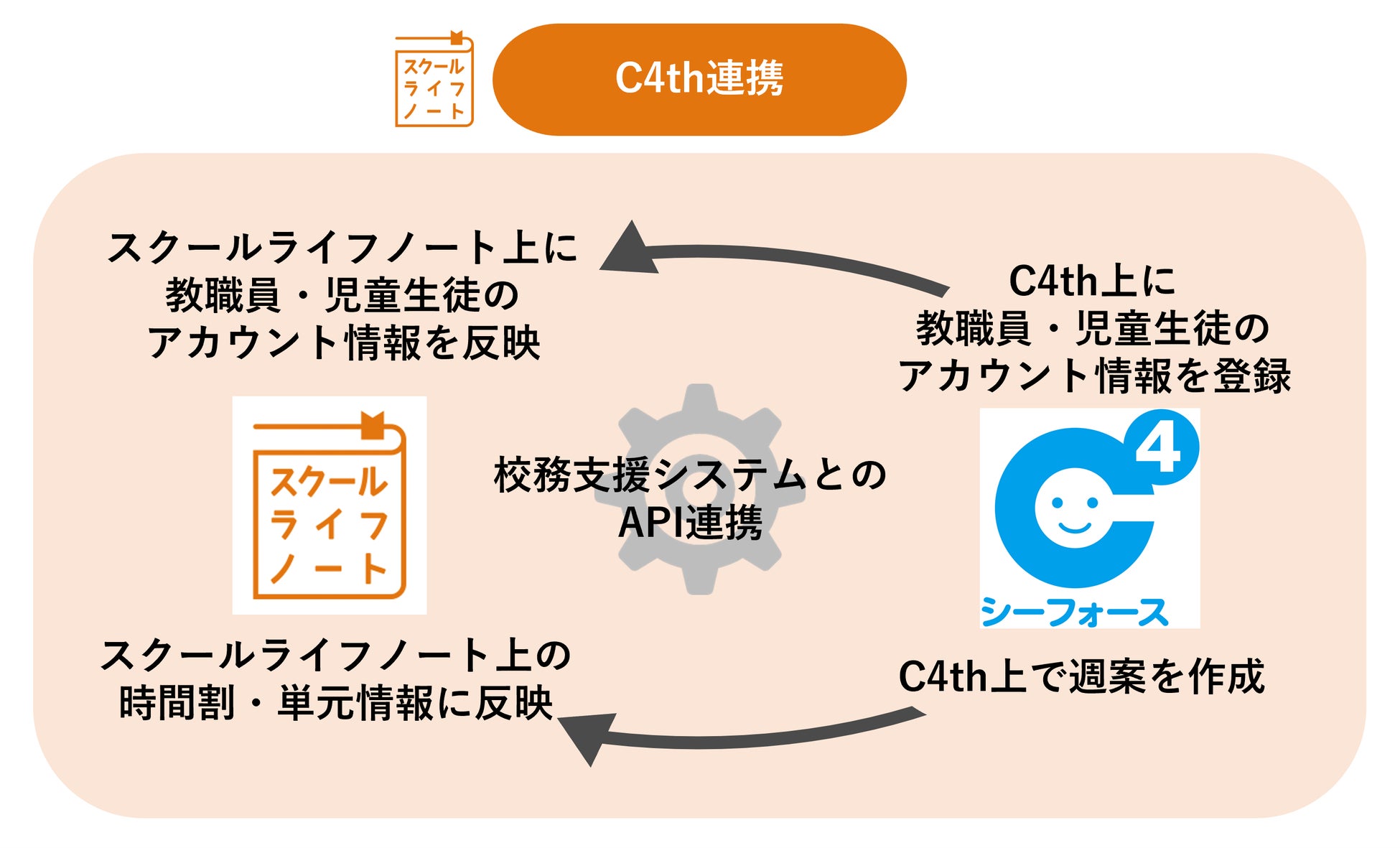 さらに、「C4th」と教職員・児童生徒アカウントの情報を連携することで、スクールライフノート上での年度初めや転出入時のアカウント管理が自動化され、教職員のアカウント管理負担を大きく軽減します。