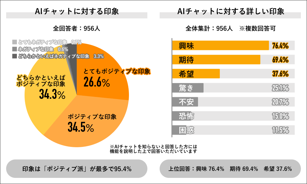 回答者全体の956人にAIチャットに対する印象を聞くと「とてもポジティブ」26.6%、「ポジティブ」34.5%、「どちらかといえばポジティブ」34.3%を合算した95.4%が”ポジティブ派”の回答をしました。