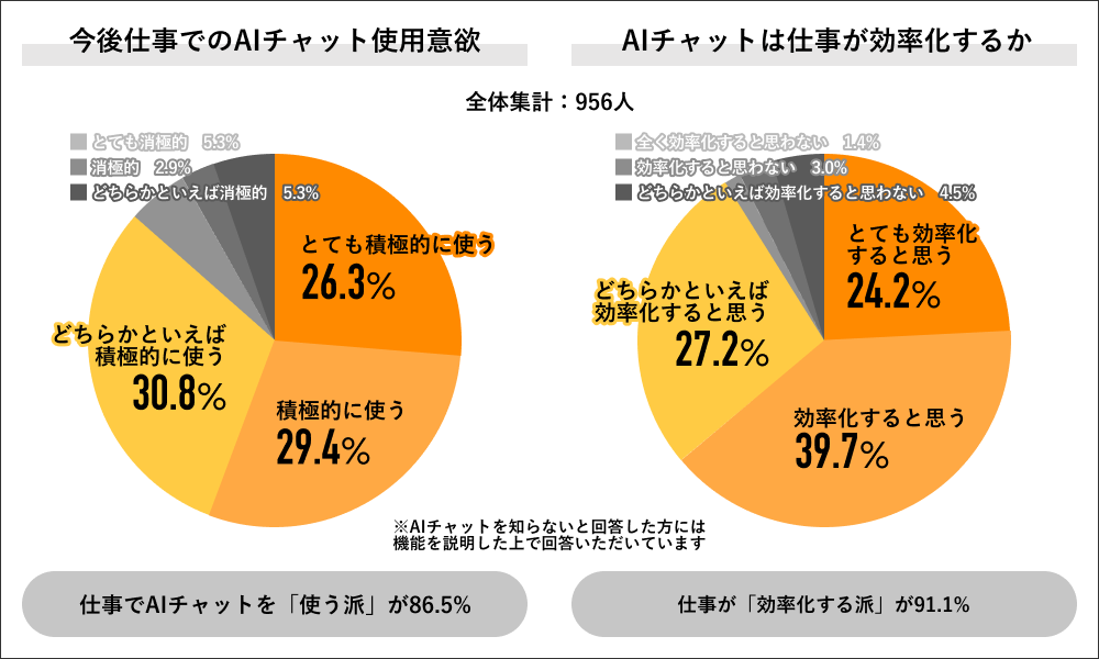 さらに今後の使用意欲では86.5%が「積極的に使用したい」と回答していることや、AIチャットを使用した場合に「仕事が効率化する」と91.1%が回答していることからも、今後はさらにAIチャットを仕事で使用する割合が高まることが予測できます。