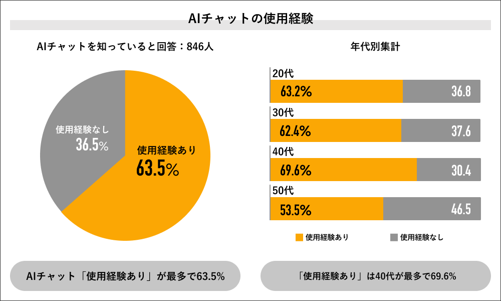 AIチャットを知っていると回答した846人に何かしらで使用した経験の有無を聞くと、63.5%が「使用経験あり」と回答し、「使用経験なし」は36.5%でした。これを年代別で見ていくと、「使用経験あり」の最多回答は40代の69.6%で、次いで20代が63.2%、30代が62.4%、50代が53.5%の結果になりました。