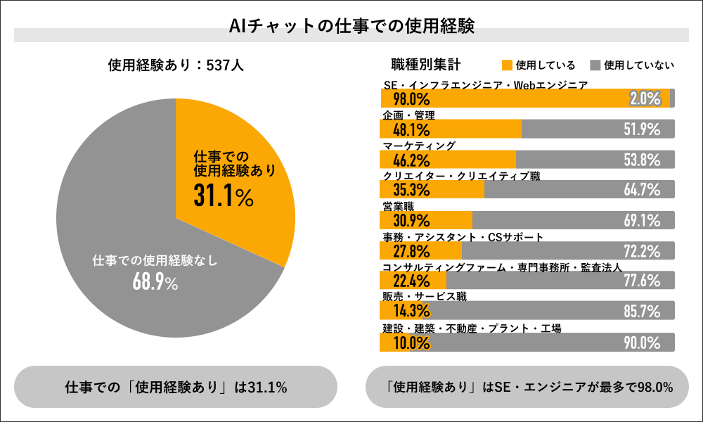AIチャットの使用経験があると回答した537人に、仕事上で使用した経験の有無を聞くと、31.1%が「仕事での使用経験あり」を回答し、「仕事での使用経験なし」は68.9%でした。