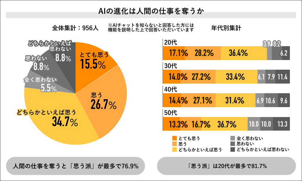 回答者全体の956人にAIの進化が人間の仕事を奪うと思うかを聞くと、「とても思う」15.5%、「思う」26.7%、「どちらかといえば思う」34.7%を合算した76.9%が”AIに人間の仕事を奪われると思う派”の回答をしました。”思わない派”の回答は全体の23.1%でした。またこれを年代別で見ていくと、”思う派”の最多回答は20代の81.7%で、次いで30代が74.6%。40代が72.9%。50代が66.7%の結果になりました。「AIに仕事を奪われる」の回答は年代が上がるごとにその印象は低くなる傾向が見られました。(※AIチャットを「知らない」の回答者にその機能を説明した上で回答をもらっています)