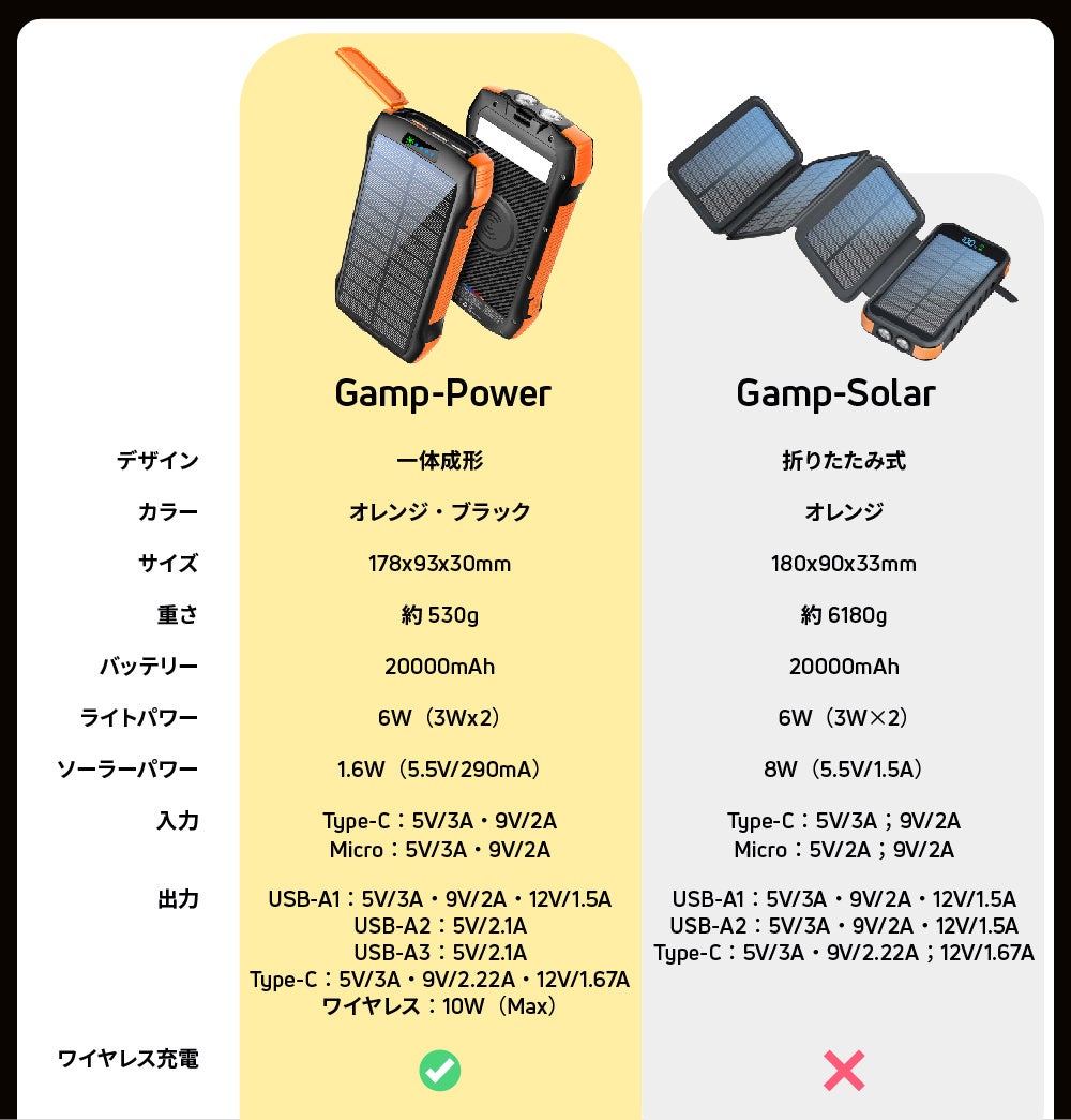 同じソーラー発電ができる機能を搭載した「Gamp-Solar」との違いをご紹介します。