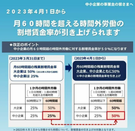 -2023年4月1日より、中小企業の月60時間超の時間外労働に対する割増賃金率が50%に引き上げられました(中小企業に対する猶予措置の終了)
